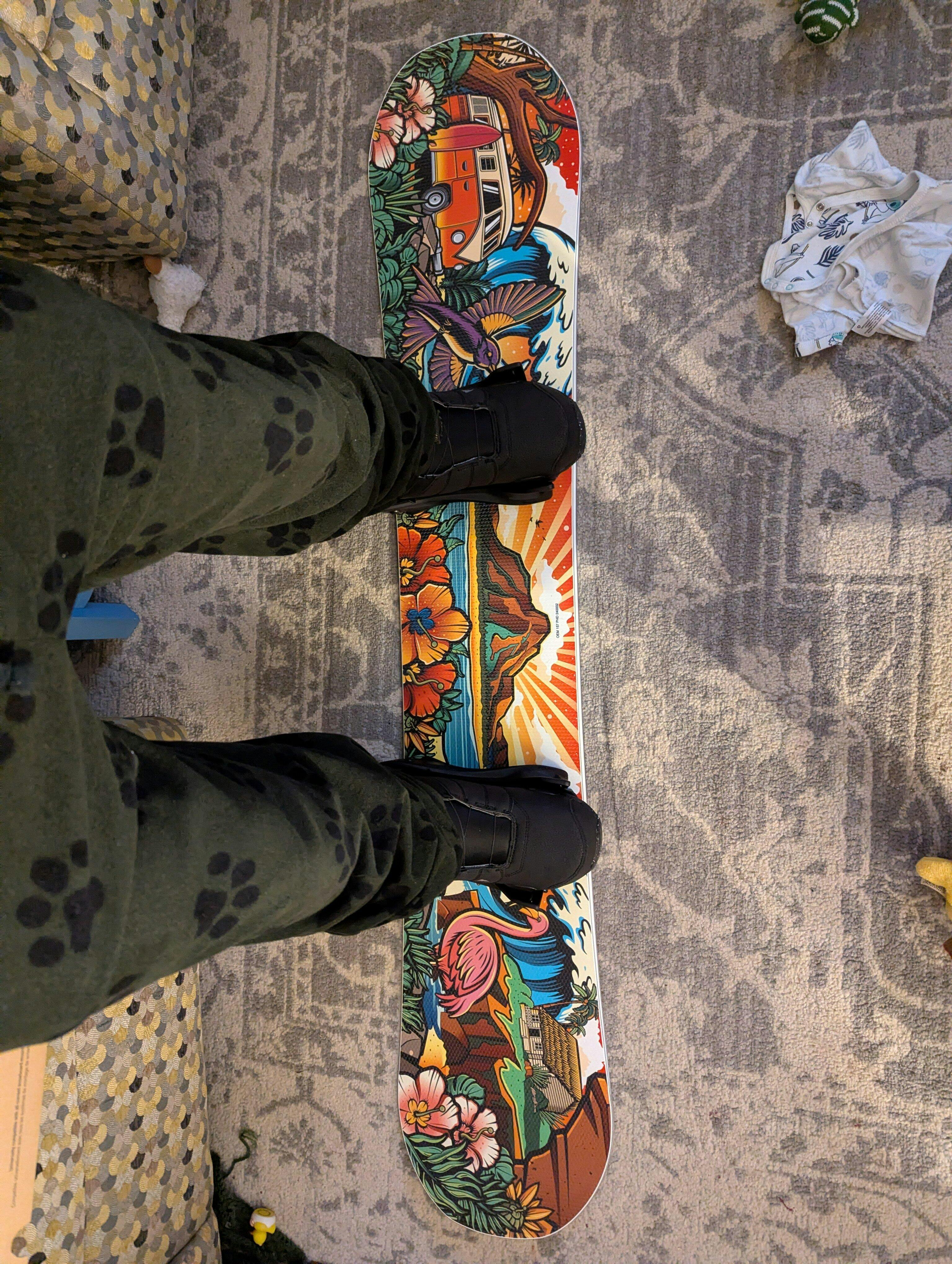It's so light and I love how it pops. I got the bindings I always wanted too and it is such a dream setup. I actually think I can improve with this board. I love it so much. The art is also amazing, and all my friends say it's perfect for me. I agree.